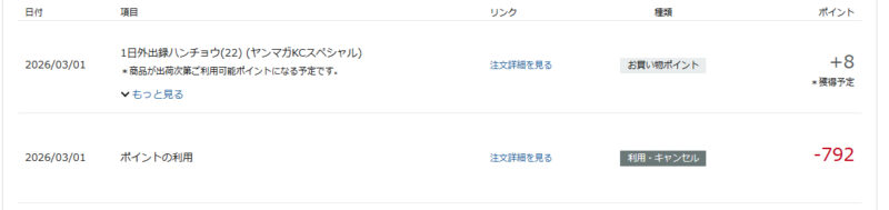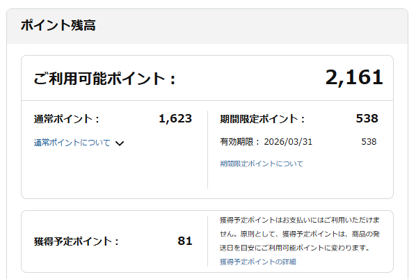 今回、Amazonギフト券にチャージしててそちら使っていたのでポイントが消費されなかったようでした。優先順位考えなくちゃ。